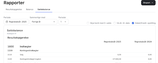 - Gå til Rapporter på menuen i venstre side og vælg Regnskab.