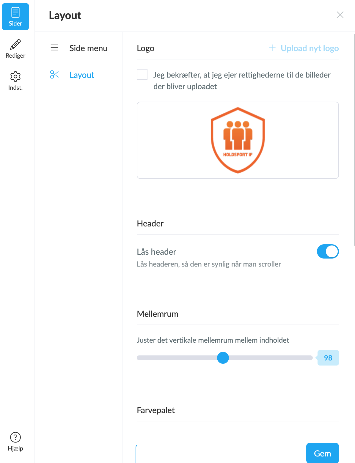 Ved at klikke på knappen Sider øverst til venstre og derefter på Layout kan du vælge layoutet for din hjemmeside: din klubs logo, mellemrum, farvepaletten, farven på titler og knapper samt farven på din sidefod.