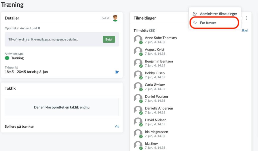 Det er muligt at føre fravær for en kalender. For at gøre dette skal du åbne den ønskede aktivitet under kalenderen.